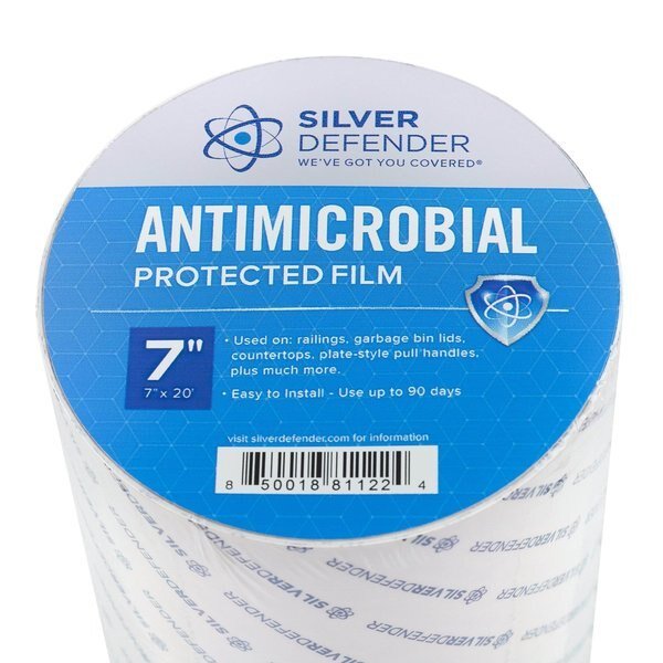 Antimicrobial Film Tape, Continuous Roll, For Use On Door Knobs; Pens; Flush Handles; Soap Dispensers; Paper Towel Dispensers, 7 in, 60 ft, 2 mil, Silver Defender(R), Effective Lifespan 2 yr, Blue/Transparent, Tape Backing Material Film, Tape Adhesive Material Acrylic, Minimum Tape Performance Temperature -25 Degrees F, Maximum Tape Performance Temperature 135 Degrees F, Specifications Met FDA Compliant