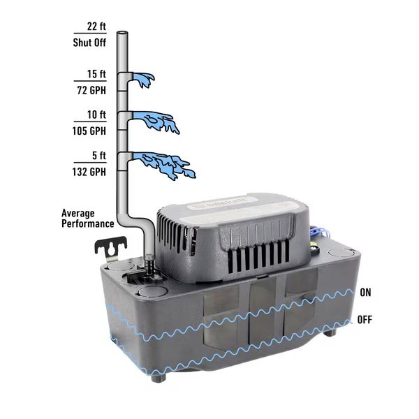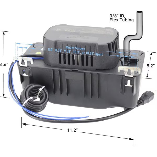 New design offers areduced noise level. Includes lid mounted bullseye level for easy installation. Rated for condensate water up to 150 F and high efficiency gas furnaces. Automatic start/stop operation with thermally protected motor. New larger 2.5 quart capacity tank means more water pumped out per cycle so pumps runs less often and last longer.