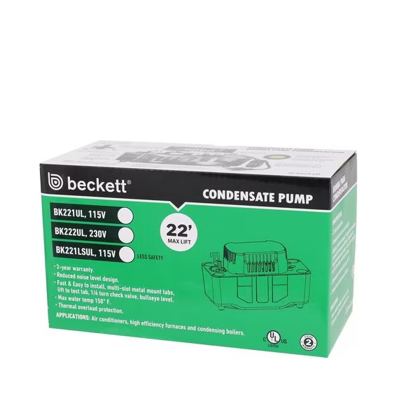 BK222UL Medium Condensate Pump w/Safety Switch, 230V, 22 Foot Max Lift, 156 gph, Beckett, Mfr#: BK222UL