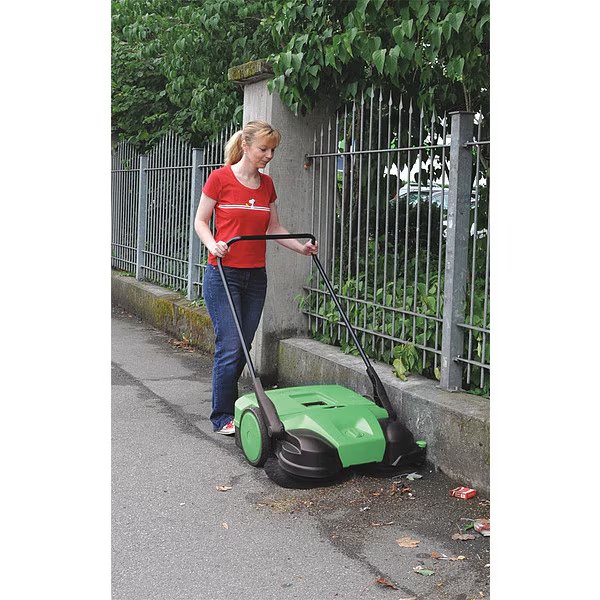 Walk Behind Sweeper, Sweeper Power Source Battery-Operated, Battery Voltage 12 V, Cleaning Path Width 31 in, Hopper Capacity 13.2 gal, Max. Productivity Area 37,000 sq ft/hr, Sweeping Mechanism Triple Brush, Sweeping Mechanism Material Fiberglass, Body Material Polyethylene, Height 42 in, Length 47 in, Width 31 in, Includes Lubricant Spray