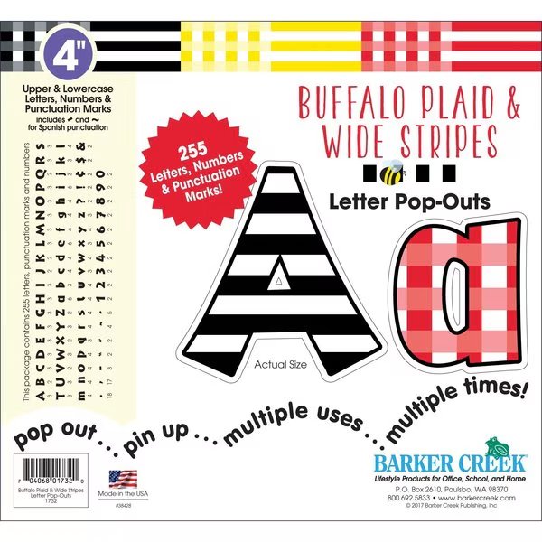 Barker Creek's Be Awesome Designer Decor Collection is perfect to fill all your classroom decorating needs Barker Creek bundled 10 of their bestselling products to bring you this Designer Classroom Set Create beautiful bulletin boards with the Motivational Posters, Letter Popouts, Accents and DoubleSided Scalloped Trim The doublesided scalloped trim can also be used to frame your doors, accent displays and special projects, decorate your office cubicle, jazz up your children's rooms at homethe possibilities are endless The Library Pockets have two selfadhesive peel stick strips on the back making them easy to adhere to file folders, binders, charts, signs, hallways, and doors Brighten up any space with the 4 Letter PopOuts Super chic and easy to read, they are perfect for your next project, presentation, report, poster, or display The name tags are so versatile Use them as name badges, of course, and also keep them handy for labeling just about everything you want to keep track of Think of all the fun ways you can use the beautiful name plates they are great for adding some posh to your learning environment Create memorable letters home, award certificates, invitations and more with the coordinating paper The motivational posters are simply stunning We all need a little boost sometimes something to stir our imaginations, broaden our horizons, bring our goals into focus, and motivate us to take the next step and our posters are perfect for this There are endless ways to use this set, it is up to your imagination The possibilities are endless Coordinating products available Search Barker Creek Buffalo Plaid Wide Stripes