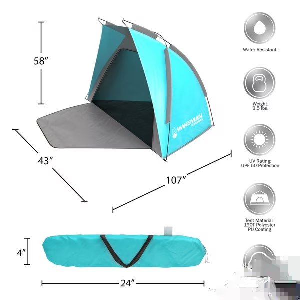 Make your outdoor adventure a memorable one by bringing along the Wakeman Outdoors Beach Tent Sun Shelter. This sports umbrella boasts a UV protection rating of UPF 50+ and features water repellent material making it ideal for tailgating, outdoor sports, a day at the beach, and more. The lightweight sun shelter has an extended floor mat that zips up into the tent for privacy and also includes a carrying case to make storage and transport a breeze. With easy set-up, this tent eliminates the hassle of pitching a tent and keeps your time spent experiencing sporting events or the outdoors.SATISFACTION GUARANTEED: Wakeman Outdoors is committed to providing the consumer with the absolute best price and value on our entire line of products, which we ensure by applying a rigorous quality control process. NOTE: This is an exclusive product of Wakeman Outdoors and ONLY Beach Tent Sun Shelters by Wakeman Outdoors.IMPORTANT: Avoid buying counterfeit products and transacting with unauthorized sellers. Look for our logo on the packaging for every one of our products. Wakeman Outdoors is a registered trademark protected by U.S. Trademark law and will be vigorously defended.