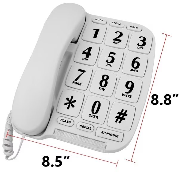 Simple but elegant Blue Donuts big button phone for wall or desk with speaker and memory. Features extra-large buttons, which make viewing and dialing much easier. With the speaker feature, you can set the handset aside and enjoy hands free conversations, or place it on the side when you’re on hold. Convenient bright red-light shines and loud ringer plays a tone, so you don’t miss a call. FEATURES: Flash, Redial, Music on hold, Hands-free speaker with volume control, LED indication for incoming call, 10 two-touch memory, Speaker volume HI/LO, Ringer volume HI/LO, For desk and wall.