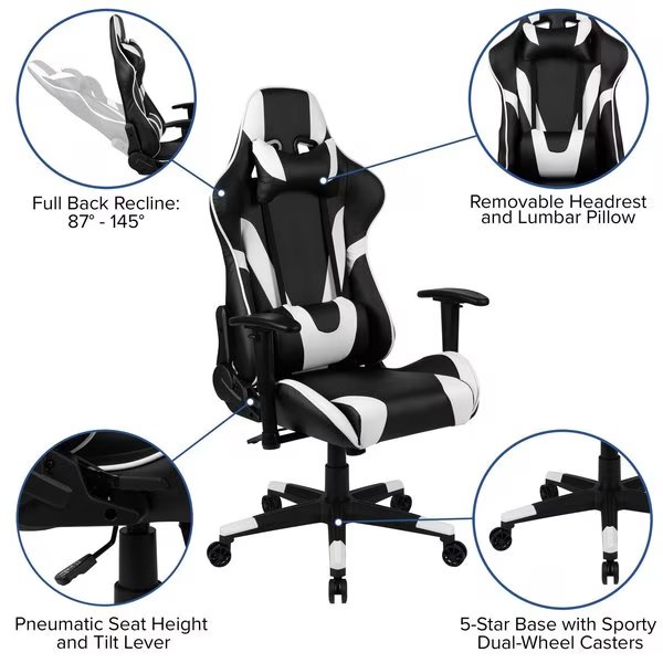 Gear up for game day any day of the week at your gaming computer desk or TV whenever you pull out this racing gaming chair. Designed to give you the ultimate gaming experience this computer game chair has a reclining back with adjustable lumbar support. If you need support, you have a headrest pillow and lumbar pillow that are adjustable and can be removed by unsnapping while the adjustable pivot arms offer pressure relief from your upper body. Gamers need ergonomic office chairs that'll keep them comfortable for many hours and this reclining gaming chair with adjustable lumbar support will provide optimal support. There's a separate lever to recline the back 87° ~ 145° while the lever underneath the seat controls the seat height and locks the chair in an upright position. You'll enjoy endless hours playing your favorite video games on this ergonomic PC chair. Now this is the way to get your game on, relaxed and reclined in your desired position. Whether you need to lean back just a little or a lot this adjustable back office chair has your back. Complete your gaming experience with our red gaming ergonomic desk with cup holder and headphone hook or black gaming desk with cup holder, headphone hook, and monitor/smartphone stand.