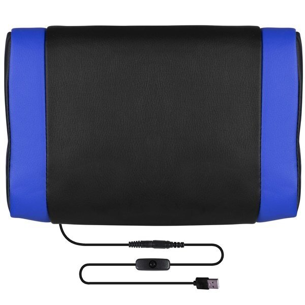 Sit back, take a deep breath and get ready to have your mind blown when you take a ride in this thickly padded, reclining gaming chair with massaging lumbar. This cool-looking game chair has a striking contrast of black and blue upholstery. The removable lumbar pillow will not only support your lower back but will also massage those tense muscles when you plug in the attached 3 ft. USB cord so you can keep that marathon gaming session going without cramping up. When you need a breather from the action, recline this high back chair 95° ~ 175° to relax and open your diaphragm. Reclining chairs cradle your body in a comfortable position while relieving pressure from your back from sitting upright. The arms actually recline along with the back to keep you comfortable. Pull the loop to slide out the footrest, flip it up and take a quick power nap to recharge your batteries. Video game chairs are designed specifically for gamers comfort but will make an excellent ergonomic chair for the office, dorm room, or home office. Easily reach work surfaces without strain with the pneumatic level and elevate your feet on the footrest while typing to relieve leg pressure. A 5-star nylon base and sporty looking casters allow you to move this chair wherever you need it. Spills clean up effortlessly with a solvent based cleaner. Get the ultimate gaming experience when you add our black gaming desk with cup holder, headphone hook, and monitor/smartphone stand or gamer workstation with headphone holder and cable management.
