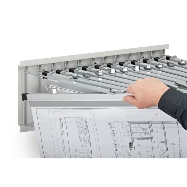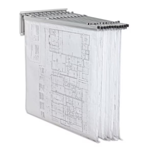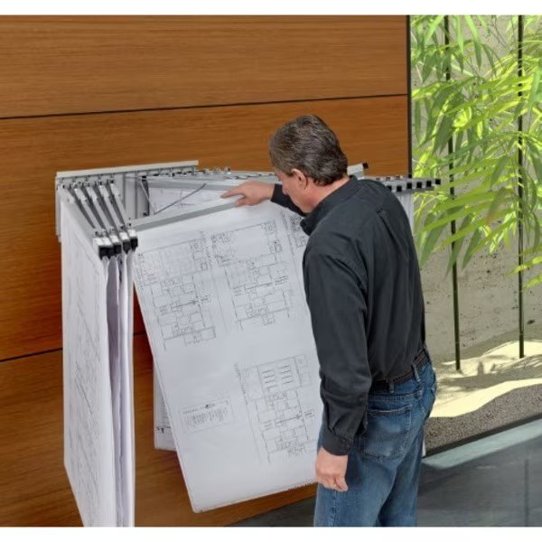 Mounted at a height of your preference, the AdirOffice Blueprint Pivot Wall Rack not only grants you convenient access to your documents, but it also saves your drawer and cabinet space. The rack includes 12 pivot brackets that swing widely and freely from side to side to easily reveal the files contents and can accommodate up to 12 hanging clamps (sold separately). Ideally, rack should be installed on solid walls or on wall studs.