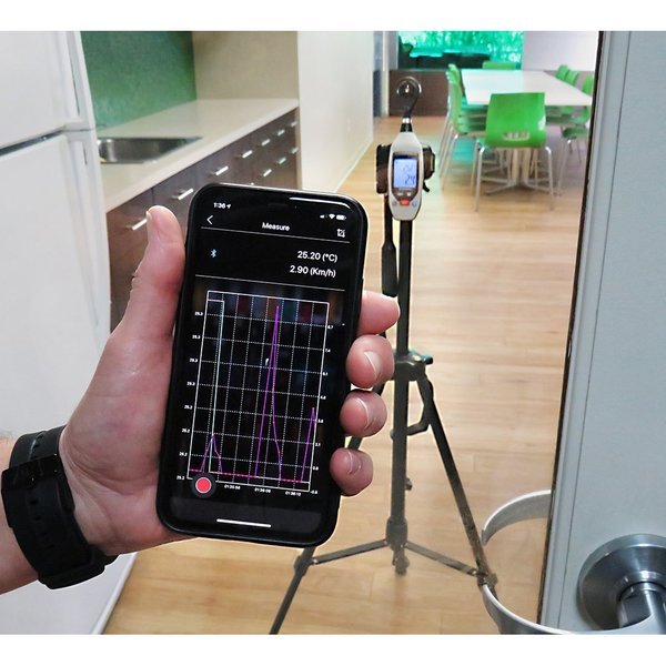 Wirelessly display, log, and transfer readings. Sper Scientific’s Bluetooth® Anemometer Meter is small, light, and simple to use. Simultaneously displays air temperature in degrees C or degrees F, and air velocity in 5 units of measure, on the meter’s large 1-1⁄2; high backlit display. Features minimum and maximum hold peak, data hold and moving average functions. The meter offers the convenience of Bluetooth® for wireless communication with free iOS and Android Apps. Results can also be remotely viewed on your smartphone in real time, saved and exported. This enables the meter to be used as a remote wireless probe and as a data logger. Comes ready to use with instructions, tripod screw, and a 9V battery. Replaceable snap-in anemometer vane is available. Dimensions: 213 × 54 × 36 mmWeight: 6 oz. 172 g Specifications Unit of Measure: Range: Resolution: Accuracy: Airspeed m/s 1.10 to 25 0.01 ±3% rdg + 0.30 m/s Airspeed km/h 4.0 to 90 0.1 ±3% rdg + 1.0 km/h Airspeed ft/min 220 to 4920 1 ±3% rdg + 40 ft/min Airspeed mph 2.5 to 56.0 0.1 ±3% rdg + 0.4 MPH Airspeed knots 2.2 to 48.0 0.1 ±3% rdg + 0.4 knots Temperature degrees F 14 to 140 0.1 ±2 degrees F Temperature degrees C -10 to 60 0.1 ±1 degrees C Downloads Instruction Manual Product Brochure Download the Sper Scientific App in the Apple or Google Play store: Comparison Chart Comparison Chart Videos