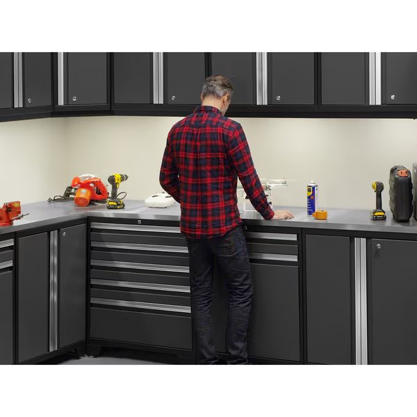 Designed to make a big statement in garages, workshops, mudrooms and other areas of your home, the Bold 3.0 Series cabinet system instantly upgrades the look of your space, providing you with organized storage for all your belongings. Built with heavy-duty 24-gauge steel for added strength, these cabinets are ready to hold everything from sports equipment to gardening tools, and the scratch and stain resistant powder-coat paint finish protects the cabinets from everyday heavy use. Full-length integrated handles allow you to quickly and easily access your gear, and adjustable steel shelves give you the flexibility to store items of all sizes, while fully-lockable doors ensure that your tools stay safe. The Stainless Steel Worktop equips you with a great work space for repairs, hobbies, and DIY projects, and is easy to wipe down and keep clean. Get organized, and simplify your life, with Bold 3.0 Series Garage Cabinets.