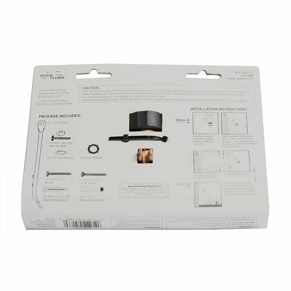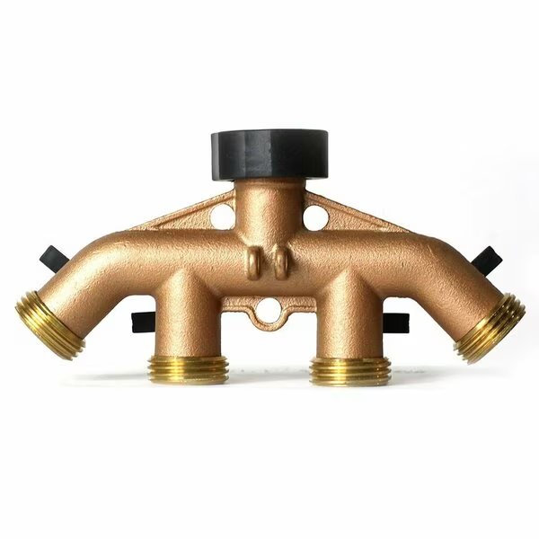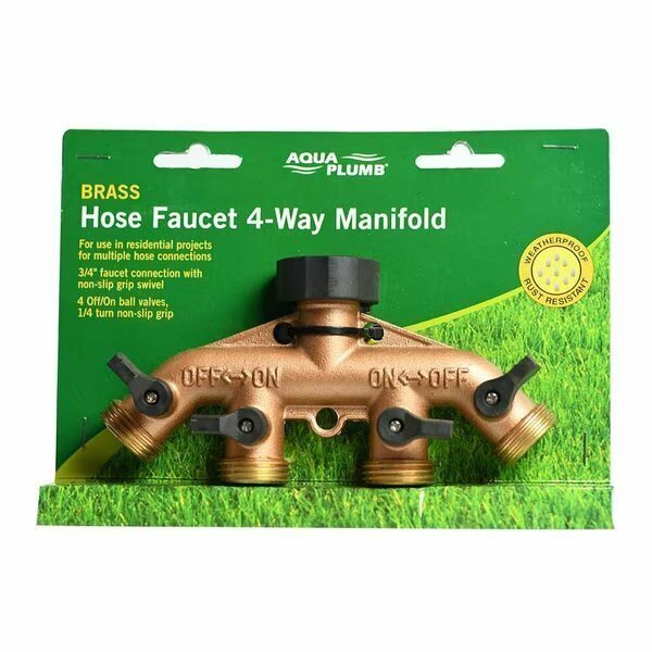Thrifco Plumbing 8429951 Brass Hose Faucet Manifold 62010. This brass manifold has 4 hose outlets with shut-offs for multiple uses. It is ideal for 1 to 4 sprinkler hose faucet valves or multiple hose connections. It includes a leak-free ball valve, a mounting brace for greater stability, and a standard 3/4 In. male threaded swivel connection.