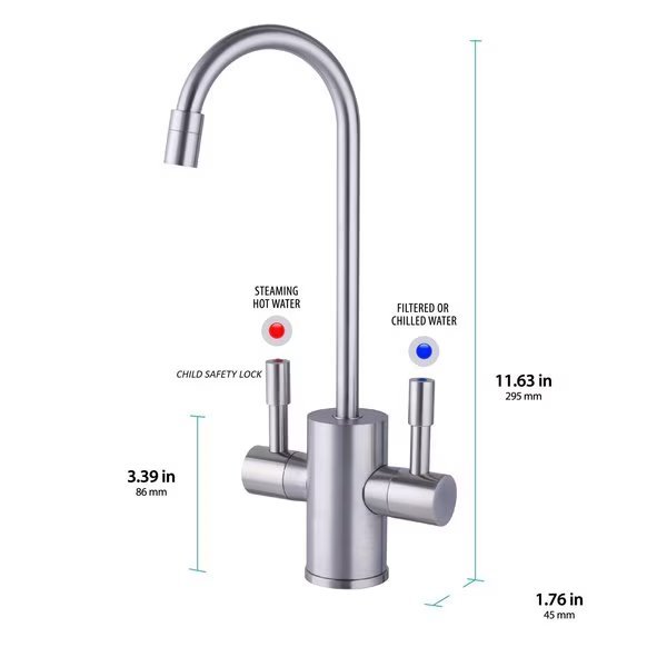 The Ready Hot dual lever Hot and Cold Water faucet in Brushed Nickel provides the ideal faucet option for your Ready Hot instant hot water tank and other compatible brands that require an open vent faucet. To protect against accidental operation, a safety lock mechanism requires the hot water lever be depressed from the top, then rotated downward to activate. Lead free and insulated, the hot water faucet includes a filter screen in the spout to filter deposits and provide good water flow.