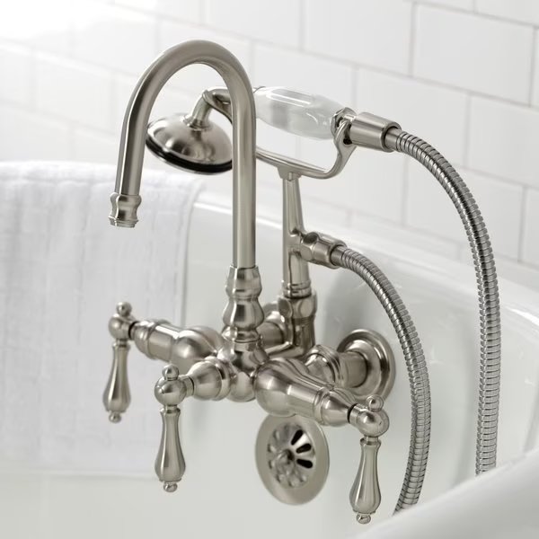 Wall mount clawfoot tub faucets are the perfect fixture to add decorative flair within your bathroom because of their unique architectural elements. With vintage opulence, this will complete your refined bathroom decorum with the help of its premium brushed nickel finish and traditionally styled handheld shower. The solid brass construction also makes for a heavy, quality made product.
