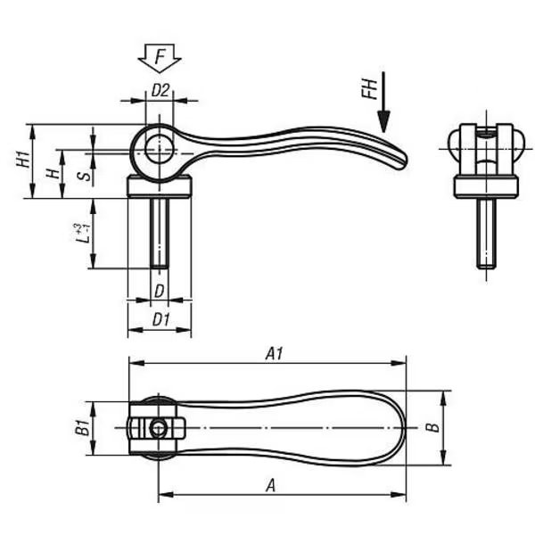 Cam Lever Size: 9 D=M03X30, A=36,2, B=14,4, Stainless Steel 1.4308 Blasted, Components: Stainless Steel. Note: all KIPP measurements are expressed in millimeters (mm) except for threads and bores on inch products, which are expressed in inches.