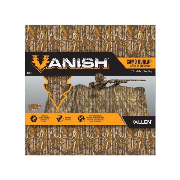 The Vanish Camo Burlap features a weather-resistant, camouflage burlap, fabric designed for multiple hunting blinds-great to use for ground blinds, waterfowl blinds, and treestands. This tough, rugged, long lasting material, in Allen Company Grain Belt Camo, is glare free, portable, and can easily form a quick improvised blind. The breathable material produces noiseless movement and measures 54-inches wide x 12-feet long. Conceal yourself season after season and watch your outline Vanish. BURLAP FOR HUNTING: Camouflage burlap fabric is breathable, easy-to-setup, produces noiseless movement, & very durable. PORTABLE HUNTING BLIND: Weather-resistant fabric has a life like corn stalks camo pattern, great for multiple blinds-ground blinds, waterfowl blinds, goose blinds, & concealed treestands. VANISH HUNTING BLIND: Long lasting material featured in Allen Company Grain Belt Camo is glare free & will conceal you season after season. DIMENSIONS: Camo burlap roll measures, 12-feet long x 54-inches wide.