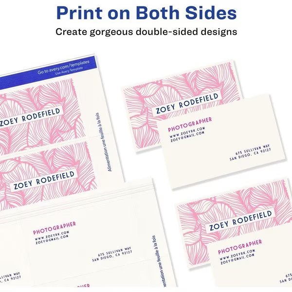 Leave a lasting first impression with these business cards. Cut from premium cardstock with a weight of 80 lb./216gsm, these quality cards immediately stand apart from everyday business cards whether you need professional business cards, appointment reminder cards, message cards or more. Every sheet of perforated cards features exclusive Avery Sure Feed technology to avoid jamming and improve print alignment. Each card is also carefully cut with a series of incisions that make it simple to tear the business cards apart while still creating a smooth edge. Whether you need a fresh business card design or want to use a design that you already have, Avery Design and Print makes it quick and easy to make your own business cards from your own office or home. Free browser-based software has the tools you need to print and design your own business cards, reminder cards, reward cards and more. Cards are compatible with inkjet printers. Each sheet includes 10 cards.