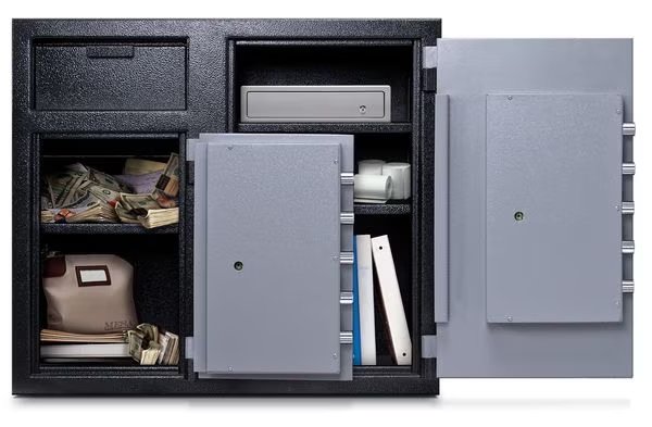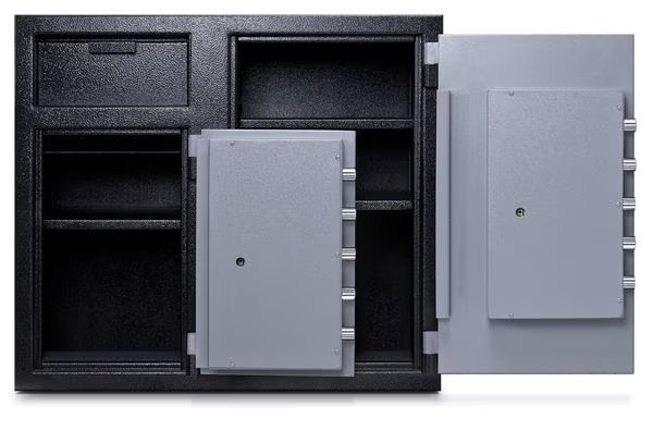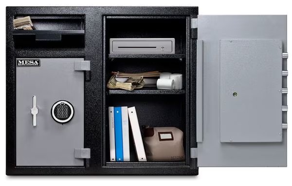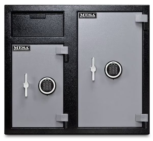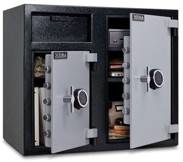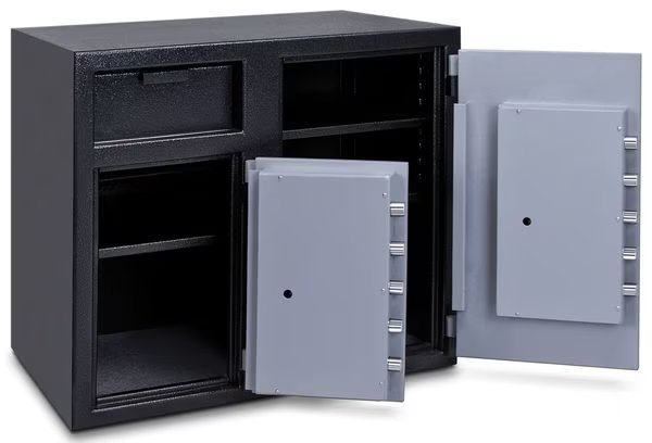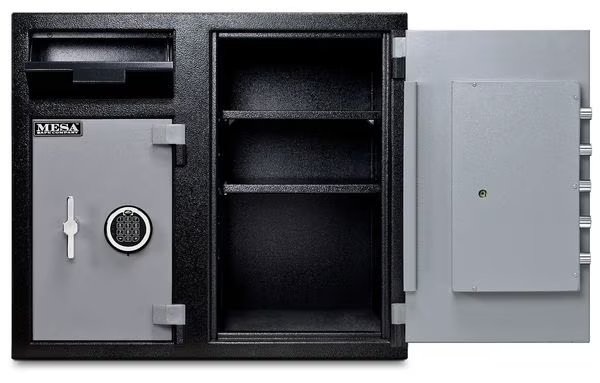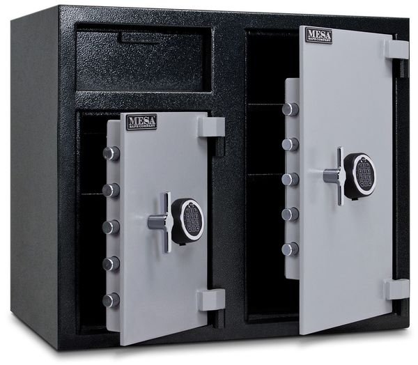 Cash Depository Safe, Two Tone Black Gray, Net Weight 256 lb, Capacity 6.7 cu ft, Not Rated Fire Rating, Water Endurance Not Specified, Material Steel, Finish Matte Paint, Max. User Codes 1 Manager and Up To 5 User Codes, Number of Shelves 2 Adjustable, Number of Doors 2, Number of Drawers 0, Lock Style Electronic, Number of Bolts 5 (Left), 5 (Right), Outside Height 27 1/4 in, Outside Width 30 3/4 in, Outside Depth 21 in, Inside Height 16 1/8 in, Inside Width 15 3/4 in, Inside Depth 18 in