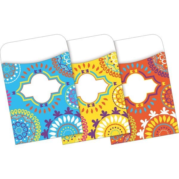 Barker Creek's Colorful Library Pockets are great for organizing flash cards, hall passes, file folder game pieces, spelling word lists, library cards, reading logs, and more This set includes 90 pockets ten each of nine colorful designs Each pocket is 3 12 x 5 18 The designs included are bohemian, moroccan, and bohemian animals Each pocket also has two selfadhesive peel stick strips on the back making them easy to adhere to file folders, binders, charts, signs, hallways, and doors Coordinating product available Search Barker Creek Moroccan, Barker Creek Bohemian, and Barker Creek Bohemian Animals