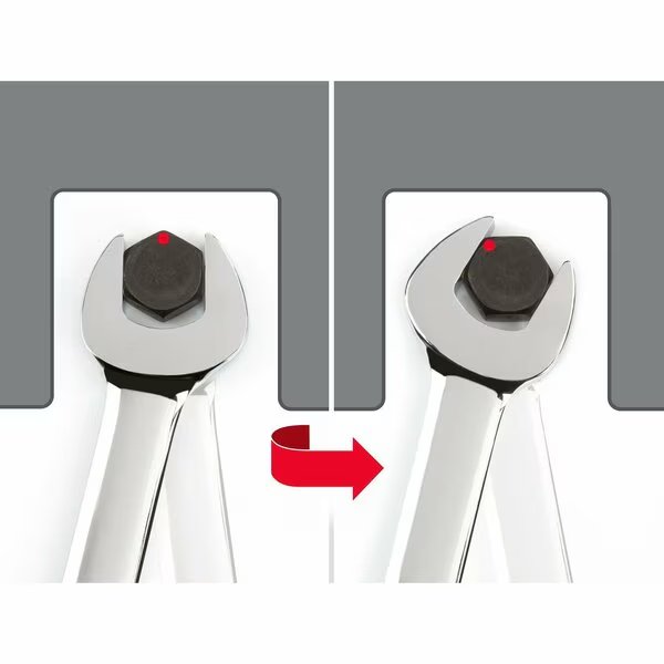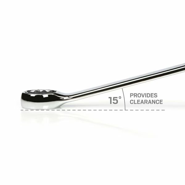 - •Angled Open End: to reduce the working swing arc in tight spaces, the wrenches' open end is angled 15 degrees so the wrench can be flipped over with each rotation to engage the fastener twice as often