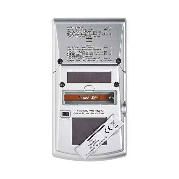 14 to 392°F/-10 to +200°C, 24 hours by hr/min; monitors temperature while cooking or cooling; displays actual & set temps & timer or clock; timer counts up/down; big digit; clock; alarm; ABS plastic; 304 stainless steel probe; sliding mode switch; temperature guide on thermometer; 5.5"/14.0 cm probe with 3'/91.4 cm sensor cable; exclusive adjustable stainless steel vessel clip; magnet/stand; one AAA alkaline battery included