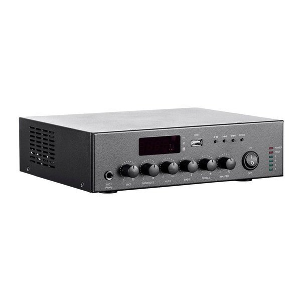 Enjoy quality Bluetooth® music playback and paging ability with this 60-watt 3-channel 100/70V Mixer Amp with Bluetooth from Monoprice. Small to medium sized businesses will benefit from the compact size of this high power music and paging audio amplifier with a 3-channel mixer. Choose from 1/4" or XLR mic inputs and RCA or 1/4" line inputs for playback of cable boxes or juke boxes. USB playback is available for controlled playback or enjoy streaming music from your mobile device using Bluetooth connectivity. Choose high-fidelity 4~8 ohm speakers or install 100/70V distributed audio speakers for more coverage of your facility. Control USB and Bluetooth playback using the included IR remote control. Features: Compact public address amplifier Supports 4-ohm; 8-ohm; and 16-ohm passive speakers Supports 70-volt and 100-volt constant voltage speaker systems Delivers 60-watts into a 4 ohm load Built-in mp3 player; FM tuner; and Bluetooth® connection Includes 1/4" unbalanced and XLR balanced microphone inputs Supports phantom power for condenser microphones Includes two line inputs and one line output Features an EMC priority input Includes short circuit; clipping; overload; and over temperature protection circuits Can accept 100 ~ 240 VAC; 50/60 Hz or 24 VDC; 4A input power Support Files: User's Manual (Jun 5; 2019) The Bluetooth® word mark and logos are registered trademarks of Bluetooth SIG; Inc. Updated Jun 5; 2019