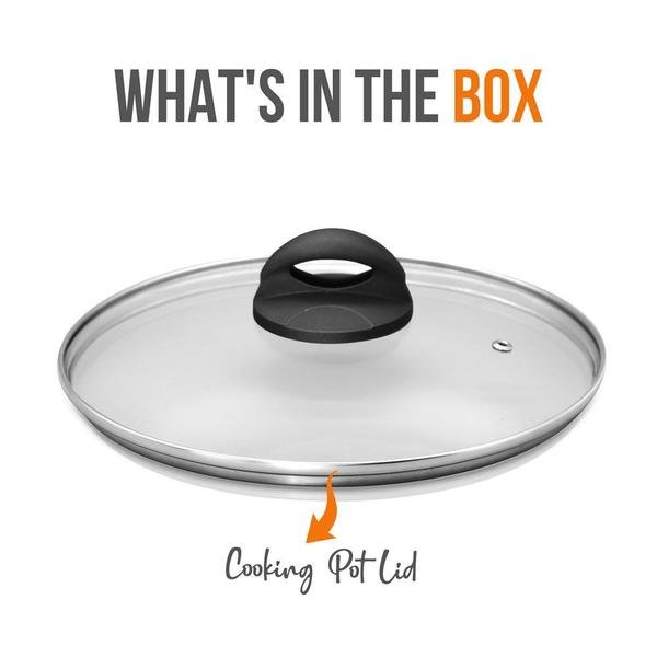 Features: - See-Through Tempered Glass Lids - Protected by a Stainless Steel Rim - Oven Safe - Sturdy and Durable - Fits 7.9'' -inches Pot - Dishwasher Safe - Stain-Resistant & Easy-to-Clean What's in the Box: - Cooking Pot Lid Technical Specs: - Max Temperature: 500° Fahrenheit (260° Celsius) - Construction Material: Tempered Glass - Cooking Pot Lid Size (L x W x H): 7.9’’ x 7.9’’ x 3.15’’ - inches
