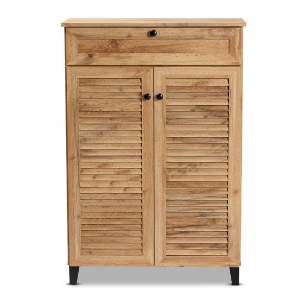 Store your shoes on the sly with the Coolidge shoe cabinet. Made in Malaysia, this shoe cabinet is constructed from sturdy wood. Five shelves located behind the slatted wood doors provide storage space for approximately 15 pairs of shoes, depending on size. Requiring assembly, the Coolidge features a large storage drawer for convenient organization of all your household essentials. Tapered legs raise the cabinet to an ergonomic height, making the Coolidge shoe cabinet a sophisticated solution to your storage needs.
