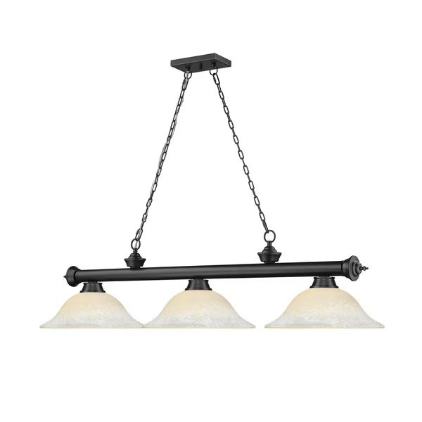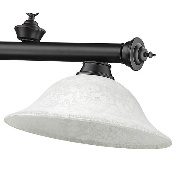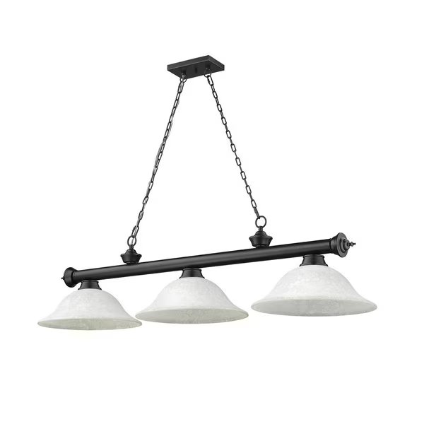 Treated to a dramatic, matte black finish with three white mottle glass shades, this traditional metal billiard light adds a fresh, modern aesthetic to classic interior decor. Suspend this stylish fixture in a kitchen, dining room, or game room to elevate your space with a warm, inviting glow.