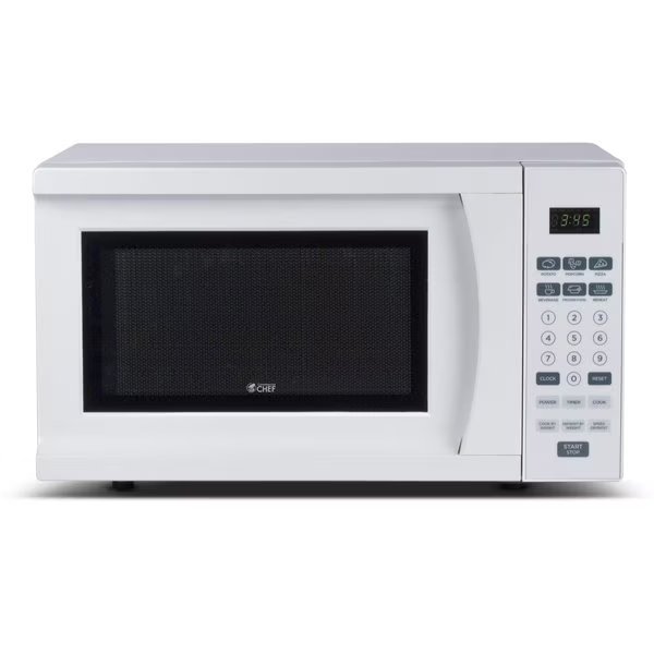 The Commercial Chef small countertop microwave provides a compact footprint while boasting up to 700 watts of power. With 0.7 cubic feet of interior space, this kitchen microwave is perfect for preparing snacks, heating up leftovers and defrosting for food preparation. Add even more cooking variety with 6 one-touch quick cook menu buttons: Popcorn, Potato, Pizza, Beverage, Reheat & Frozen Food. Recessed door handle with child safety lock provides a flat-front surface that is easy to open and stays closed. Push button controls with LED display also include a digital clock and timer for easy & simple operation. Start/stop push button helps begin and quickly shuts off the microwave when you need it. The 9.5 glass turntable is removable and dishwasher safe for easy cleaning. Turntable automatically rotates contents to provide even cooking throughout and to prevent one side cooking quicker or slower than the other. Defrost by weight according to the food you need, or use the Speed Defrost feature. This setting works by alternating between defrost and stand times to quickly and effectively defrost foods. Compact microwave measures 17.75 W x 13.13 D x 10.25 H. UL listed.