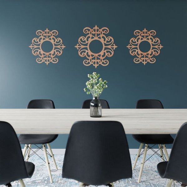 Available in paint-grade, oak, cherry, alder, walnut, hickory, and birch allowing for great versatile and durable usage. The natural wood tones evoke luxury and sophistication in any space. You can leave your design mark with unique and inspiring effects on your walls, ceilings and more. Our easy-to-install wood medallions can turn a fixture or ceiling fan into a work of art in no time at all. Our distinctive pierced wood medallions add instant value to your home and stand apart from everything else on the market.Clean and modern designs, expertly laser cut wood veneer over a MDF core.