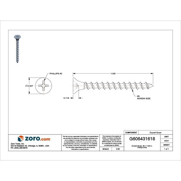 Drywall Screw, #6 x 1-5/8 in, Phillips Drive