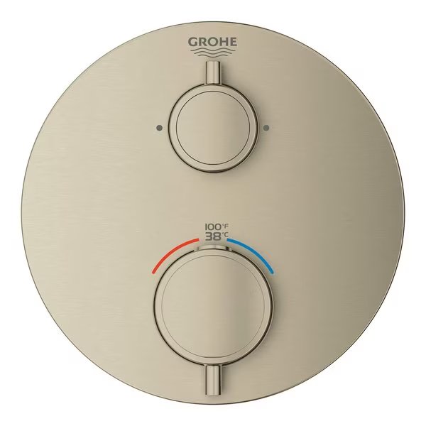 From its slim profile to its intuitive design, the GROHE Grohtherm Dual Function 2-Handle Thermostatic Trim with Control Module streamlines the bathroom in both style and experience. Clean and contemporary, it features an upper handle with integrated 2-way diverter to easily switch from shower head to hand shower, and a lower handle to control temperature. Thoughtfully designed for comfort and enjoyment with GROHE Turbostat to maintain consistent temperature and GROHE SafeStop to prevent scalding.