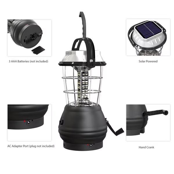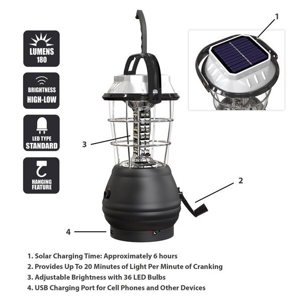 Keep this Rechargeable Lantern by Whetstone handy in case of a power outage or for taking on camping, hiking, or fishing trips. This 180-lumen emergency light is conveniently powered by the lantern's built-in dynamo hand crank, solar panel, 3AAA batteries, or AC adapter. With the LED bulbs lasting up to 100,000 hours, the battery lamp includes high, medium, and low settings that allow you to adjust the brightness levels when reading or working. The camping light also comes equipped with a USB port for charging your tablets, phones, and other electronic devices when off the grid.IMPORTANT: Whetstone is committed to providing the consumer with the absolute best price and value on our entire line of products. NOTE: This is an exclusive product of Whetstone and ONLY Camping Lights by Whetstone. Avoid buying counterfeit products and transacting with unauthorized sellers.