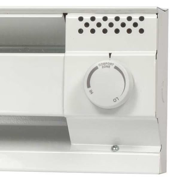 Electric Baseboard Heater Thermostat, 120/208/240V AC, 3 3/4 in Overall Depth, 6 1/8 in Overall Height, 3 3/4 in Overall Width, Compatible System Type Baseboard Heaters, Number of Poles 1, 22 A, Housing Color White, Knob and (2) Screws, Single Pole, White Cover Plate, Mounting Type Unit Mount, Programming Capability Not Programmable, Mechanical Selector Dial, UL Listed, Maximum Operating Temperature 85 Degrees F