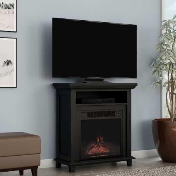 Add a spark of style and function in your living space with the ventless Electric Fireplace TV Stand by Hastings Home. This 29-inch tall entertainment console features a mantel that fits flat screen televisions up to 32-in, an open media shelf for cable boxes, DVD and Blu-ray players, and an electric fireplace insert that can heat up to 400 square feet. Its slim profile is ideal for tight spaces, small rooms, apartments or an office. With a push of a button, you can turn the heat function on or off and enjoy the warm glow of the LED flame over the decorative logs, providing you the right mix of comfort and style year-round in any room, any season!