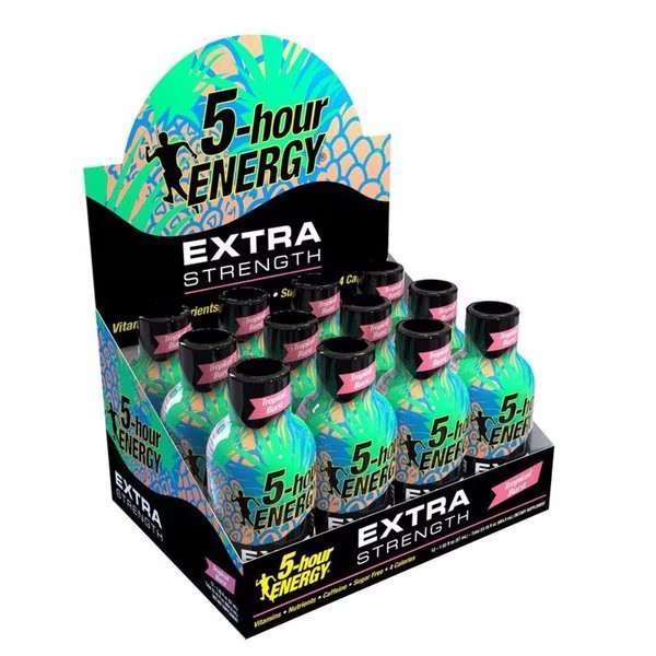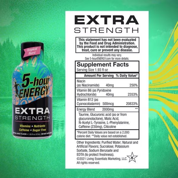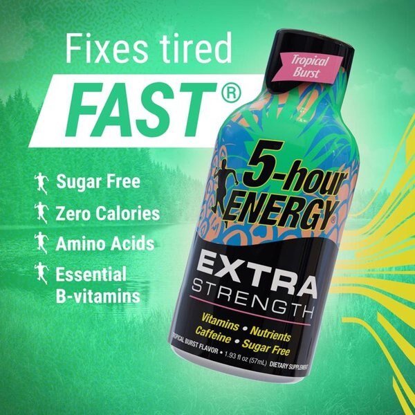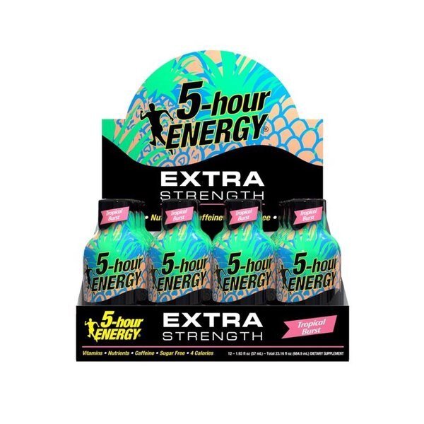 Whether youÆre fighting the day to feel energized or getting prepared for a large backyard cookout Tropical Burst flavored Extra Strength 5-hour ENERGY shots are the perfect companion for those who donÆt want to slow down. Small size at 1.93 ounces make them fast to take. Pack sizes will help you make sure you have them on hand for when you need them the most. Extra Strength 5-hour ENERGY contains zero sugar four calories amino acids B vitamins and caffeine comparable to 12 ounces of the leading premium coffee. 5-hour ENERGY is AmericaÆs #1 selling energy shot.