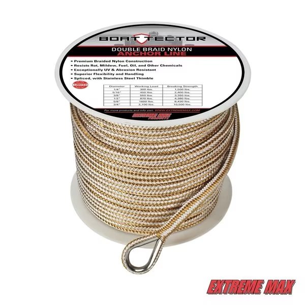 Extreme Max 3006.2255 BoatTector Premium Double Braid Nylon Anchor Line w Thimble-3/8" x 300' &Gold, Extreme Max, Mfr#: 3006.2255