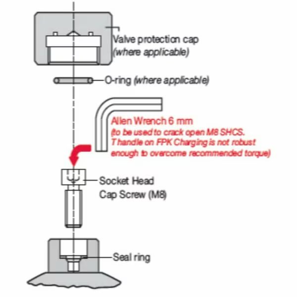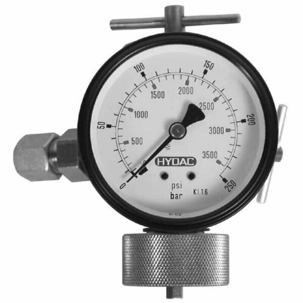 Hydac Accumulator Charging Kit Type FPK for use with Gas Valve Version 1 M28 x 1.5 for SBO and SK. To maintain system performance HYDAC recommends that the gas precharge pressure is checked regularly. The inevitable loss of gas precharge pressure due to permeability will change the system effectiveness performance and could cause damage to the bladder, diaphragm, or piston accumulator.HYDAC charging and gauging units allow hydro-pneumatic accumulators to be precharged with dry nitrogen. For these purposes, a charging and gauging unit is connected to a commercially available nitrogen bottle via a flexible charging hose.These units also allow maintenance personnel to check the current gas precharge pressure of an accumulator. For critical systems, consider the use of a permanent gauging block which will provide for continuous monitoring.