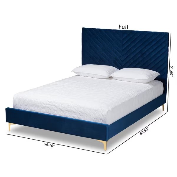 Drift off to sleep in magnificent fashion with the refined elegance of the Fabrico platform bed Made in Malaysia, this chic piece consists of a solid wood frame padded with foam and upholstered in lavish velvet fabric for a truly luxurious embrace The tall headboard features a sleek chevron tufted design for a striking display that provides superb back support when sitting in bed The Fabrico requires assembly and utilizes wood slats for mattress support, removing the need for a box spring Polished metal legs complete the opulent design, making the Fabrico platform bed a fantastic upgrade to the modern bedroom