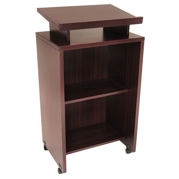 Lectern, Color Mahogany, Mobility Mobile, Material Laminate, Overall Height 44 in, Overall Width 24 in, Overall Depth 18 in, Wattage Not Applicable, Voltage Not Applicable, Sound System Included Not Applicable, Includes Document Rail Yes, Shelf Width 24 in, Shelf Depth 18 in, Microphone Type Not Applicable, Includes Sound System No, Caster/Glide Type (2) Locking, (4) Casters, Compatible Microphone Connectivity Not Applicable, Included Microphone Connectivity Not Applicable, Locking Casters Yes