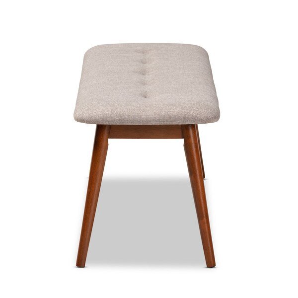Featuring a stunning medium oak finish, the Flora dining bench brings warmth to any dining space. Constructed from solid rubberwood, the Flora is upholstered in a soft, durable polyester fabric and padded with foam. Expert craftsmanship is displayed in the curved edges and the smooth grained finish. Designed for everyday use, the seat is supported by four angled, tapered legs that create a modern profile while also providing ample legroom. A single row of button tufting adds a decorative touch. The Flora dining bench requires assembly.