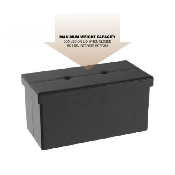 Bring the best of style and function to your home with the Large Faux Leather Foldable Storage Bench by Hastings Home. This bench features a premium, faux leather vinyl that is both easy to clean with a soft, damp cloth and stylish. The modern, clean lines bring a chic style to your home. This versatile storage trunk is constructed from sturdy MDF material to give it a 500-pound weight capacity as a seat and 50-pound capacity as a storage cube. The button tufted cushioned top with foam padding provides ample comfortable seating.The collapsible design makes it easy to set up in seconds! It can be folded flat when not in use for convenient storage, making it ideal for dorms, RVs and small apartments. This multipurpose storage trunk is great to use as a foot rest, bed stool, toy chest, coffee table, and more. It makes a wonderful stylish addition to any bedroom, living room or utility room while keeping your belongings organized.
