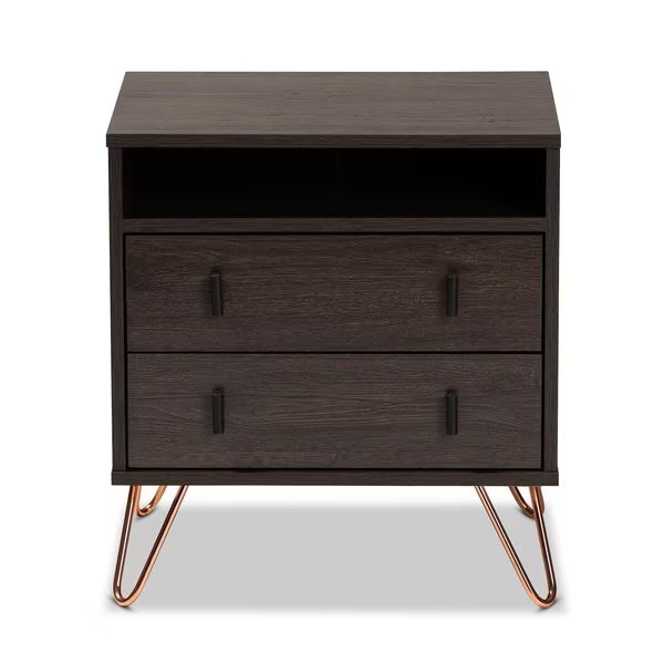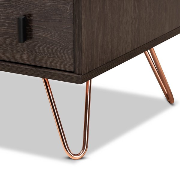 Glover Modern Dark Brown Finished Wood and Rose Gold-Tone Finished Metal 2-Drawer Nightstand, Baxton Studio, Mfr#: 179-11220-Zoro