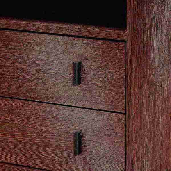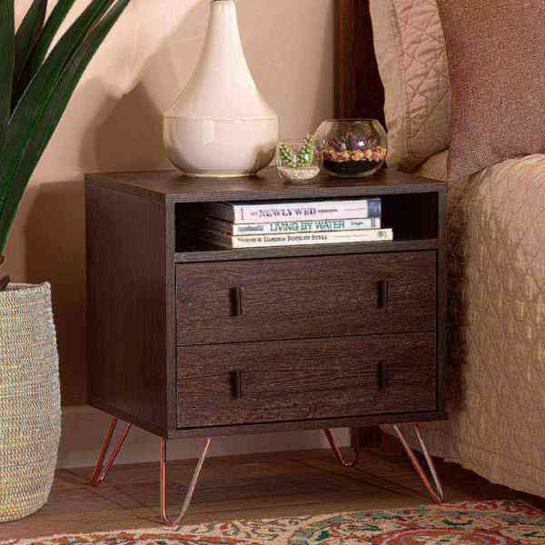 Bring modern convenience to your bedside with the handy Glover nightstand. Made in Malaysia, the Glover is constructed from sturdy wood showcasing a rich dark brown finish. Two wide drawers provide concealed storage, while an open shelf and rectangular tabletop allow for easy organization of bedside essentials and decorations. Requiring assembly, the Glover is fitted with rose gold tone metal legs for excellent stability and a cool, modern look. Long rectangular black drawer handles add minimalist charm, making the Glover nightstand a chic addition to any space.
