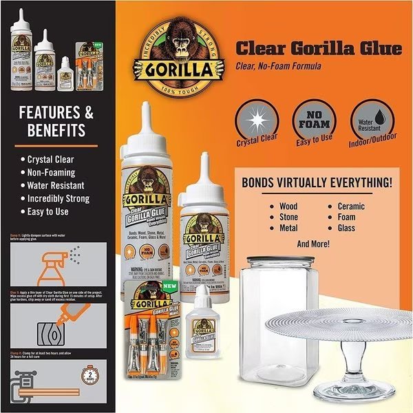 Glue, Adhesive Color Clear, Application Method Applicator Tip, Clamp Time 2 hr, Container Size 3.75 fl oz, Container Type Bottle, Features Incredibly Strong, Non-Foaming, Full Cure Time 24 hr, Gap Fill (Yes/No) No, Materials Bonded Ceramic, Foam, Glass, Metal, Stone, Wood, Primary Applications General Purpose, Water Resistance Water-Resistant