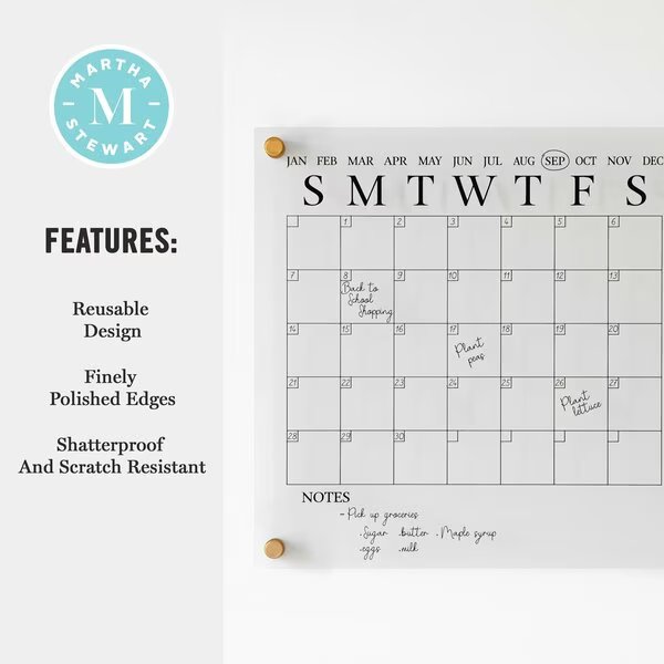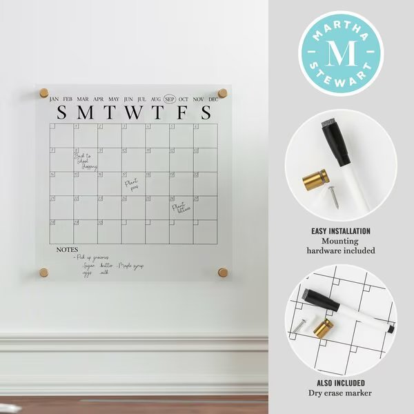 Organize your life and your desktop with the Martha Stewart Acrylic Monthly Wall Mounted Calendar. The polished edges eliminate the need for a frame while the included mounting hardware gives a dimensional appearance for a chic statement anywhere in your home. Comprised of premium crystal clear acrylic for enhanced strength and overall brightness, this wall planner is scratch-resistant and waterproof for long-lasting use. Supplemented with a monthly blocked calendar available in 2 printed colors and a dry erase marker for adding important dates that can be wiped clean with a dry cloth and repopulated at the start of each new month.