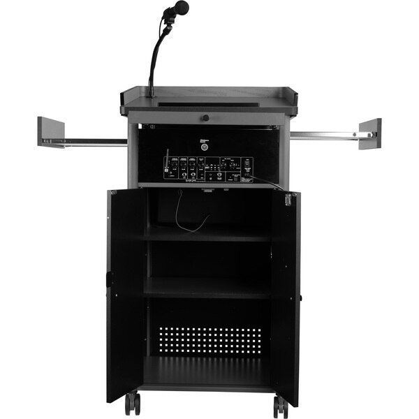 The Greystone Lectern with sound from Oklahoma Sound is far more than just a basic lectern. This elegantly designed unit offers an all-in-one presentation experience. Large reading surface (22.75”W x 18.25”D), two side pull-out shelves (14.25”W x 12”D), and a sliding keyboard tray (17.5”W x 9.25”D) provides for a complete multi-media presentation experience. Designer curved grey plywood adds a sophisticated look. The cabinet includes three large shelves plus an oversized front drawer for ample storage. 2.5” hooded twin wheel matching casters makes for easy mobility. Elegance & functionality for all your presentation needs. This model operates with a rechargeable battery.