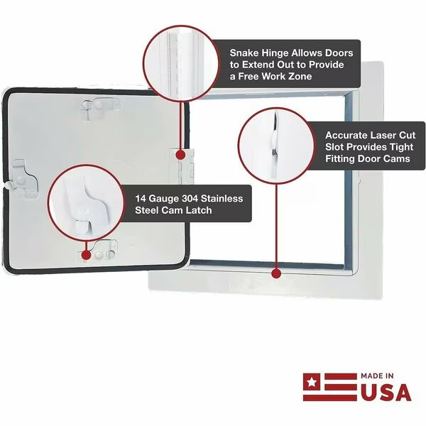The Linhdor Access Door exemplifies heavy-duty resilience and functionality, fashioned from a sturdy 16 Gauge steel frame coupled with a robust 14 Gauge steel door. This interior metal access door, suitable for both ceiling and wall installationsand is compiant with government inspections.. The design eschews mitered corners, opting instead for a singular frame and radius corners throughout to eliminate sharp edges, while its recessed nature ensures it aligns seamlessly with drywall or ceilings, offering an aesthetically pleasing finish to any structure. Durability remains paramount with its rust-resistant galvannealed steel construction, while the drywall door panel boasts extensive cam slots ensuring steadfastness and countering sagging. Practicality meets performance with its 14 gauge 304 stainless steel cam latches, designed for effortless opening thanks to a large screwdriver slot, and a concealed snake hinge providing an expansive 165-degree opening.