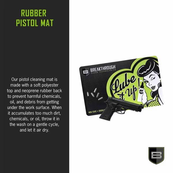 Our Breakthrough Clean Technologies Handgun Cleaning Mat with a soft polyester top and neoprene rubber backing to keep everything in place and prevent your work surface from sliding around. This mat will also keep harmful chemicals, oil and dirt from getting to the work surface under the mat. When the mat begins to accumulate too much dirt, chemicals or oil, simply throw it in the wash on a gentle cycle, and allow to air dry. Mat measures 17-inches long x 11-inches wide. GUN CLEANING MAT: Keep your workspace surface steady & secure without having to worry about small parts & pieces rolling all over the place. This mat prevents harmful chemicals, oil, & debris from getting under the work surface. NEOPRENE MAT: Our handgun cleaning mat is made with a soft polyester top, neoprene rubber back, & measures 17'' x 11''. When it accumulates too much dirt, chemicals, or oil, throw it in the wash on a gentle cycle, & let it air dry. GUN CLEANING SUPPLIES: Add this essential cleaning mat to your handgun cleaning kit. It's a must-have for gun owners who need a heavy-duty & absorbent surface to work on while cleaning, building, & disassembling their firearms. SHOOTING ACCESSORIES: Prevent scratches & marring on the surface of your workbench, countertops, table, & deck with our functional gun cleaning mats for all guns. It's a thoughtful gift idea for gun owners who regularly work on their firearms.