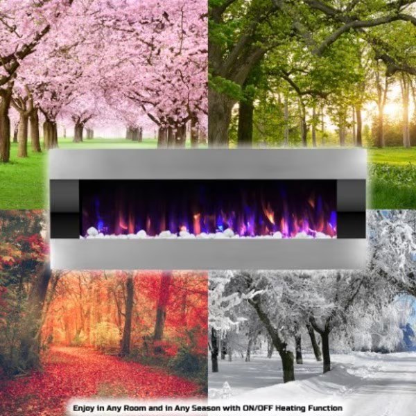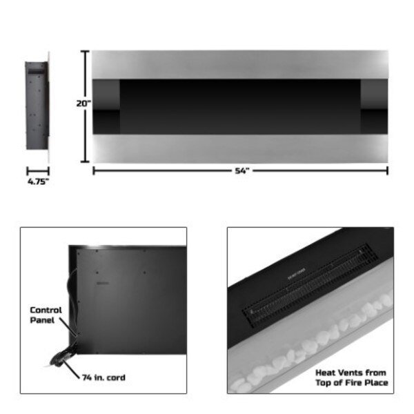 This 54-inch Electric Fireplace by Hastings Home can heat up to 400 square feet and enhance your home decor with its sleek style and ambiance created by the glow of the LED flame. This attractive stainless-steel fireplace is vented in the front so it can be hung on the wall, has adjustable heat settings, a built-in timer and 3 flame color options that all can be controlled by a remote. Operating at 750W on the low heat setting and at 1500W on high, this versatile electric fireplace also has a no heat option for year-round use without the hassle of cleaning or maintaining a chimney.