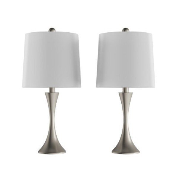 This set of Flared Table Lamps from Hastings Home illuminates your space while adding a touch of elegance to your home. Their silver metal tapered bases are paired with ivory drum shaped fabric shades for a soft mid-century modern style perfect for your living room, entryway, bedroom, or office. Each lamp comes with an energy-efficient 9W 805 lumens LED bulb that will brighten your room for 25,000 hours before needing to be replaced.