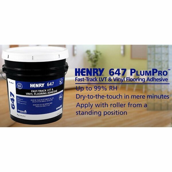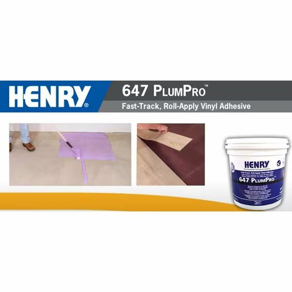 Henry 647 PlumPro is an ultra-fast-track, roller-applied adhesive ideal for quick turnaround, residential and commercial vinyl flooring installations. Including all applications of commercial and residential installation of luxury vinyl tile and plank (LVT and LVP), fiberglass-encapsulated sheet vinyl (cushion back) On all grade levels: concrete, well-bonded cementitious underlayment's, APA-grade underlayment plywood (untreated), radiant-heated subfloors where temperatures do not exceed 85F (29C), terrazzo, ceramic tile, metal, certain epoxy coating sand existing, fully-adhered, non-cushion-backed resilient. Ideal for DIY or large commercial applications for ease and high quality installations. Open to traffic in just minuets make it great in high traffic areas. Moisture resistant up to 95% RH level and a unique easy to see color. Sold as a 1 gallon.